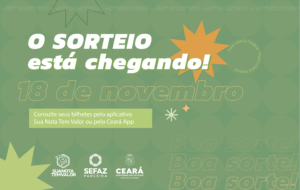 A Secretaria da Fazenda do Ceará (Sefaz-CE) informa que o 40º sorteio do programa Sua Nota Tem Valor (SNTV) será realizado no próximo sábado (18/11), em virtude de mudança no calendário da Loteria Federal. Marcado, inicialmente, para ser realizado na quarta (15/11), a mudança da data ocorreu em virtude do feriado da Proclamação da República.