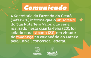 A Secretaria da Fazenda do Ceará (Sefaz-CE) informa que o 41º sorteio do programa Sua Nota Tem Valor (SNTV) será realizado no próximo sábado (23/12). Marcado, inicialmente, para acontecer na quarta-feira (20/12), a alteração da data ocorreu em virtude de mudança no calendário da Loteria Federal.