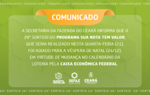 A Secretaria da Fazenda do Ceará (Sefaz-CE) informa que o 29° sorteio do Sua Nota Tem Valor, que seria realizado nesta quarta-feira (21), foi adiado