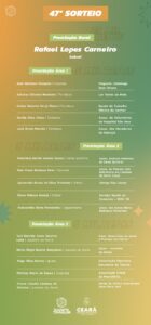 A Secretaria da Fazenda do Ceará (Sefaz-CE), por meio do programa Sua Nota Tem Valor (SNTV), anuncia nesta sexta-feira (21) os nomes dos ganhadores do 47° sorteio da iniciativa. Rafael Lopes Carneiro ganhou a premiação principal de R$ 25 mil. Outras 15 pessoas e 15 instituições sem fins lucrativos escolhidas por elas receberam os prêmios de R$ 5 mil. O sorteio n° 5876 foi realizado pela Loteria Federal na quarta-feira (19).
