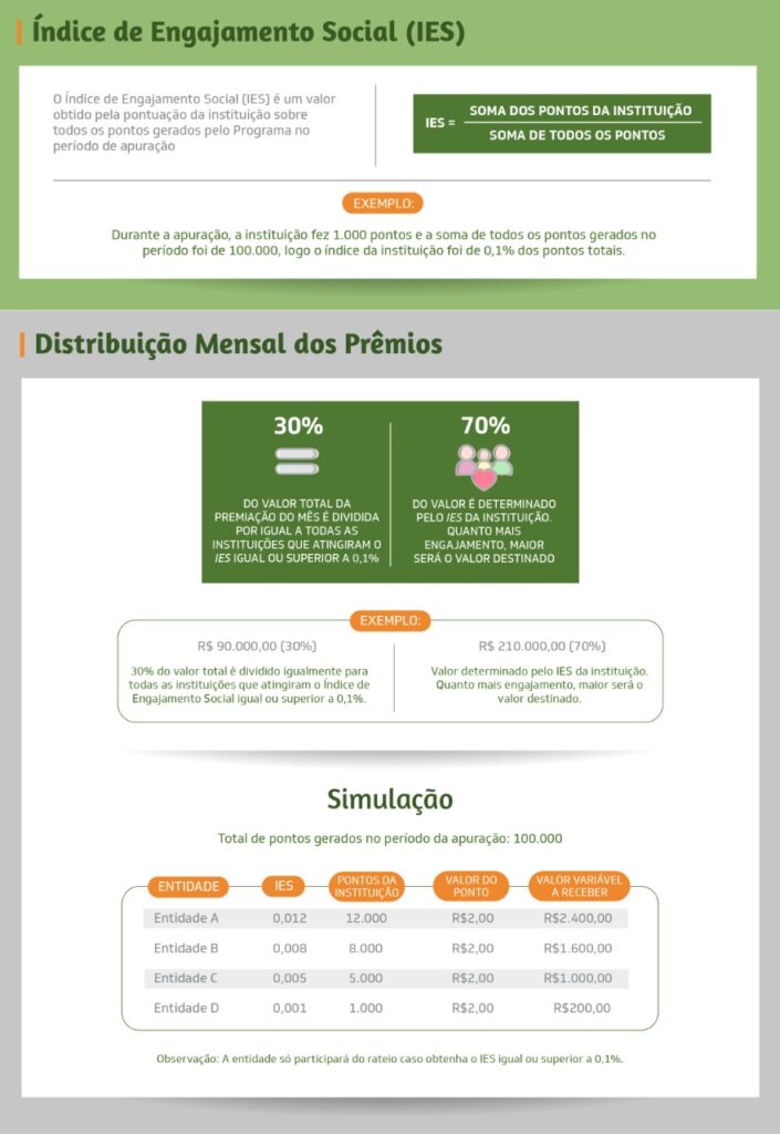 Cada ponto que ele fizer, a Instituição terá um ponto para o Rateio, aumentando o engajamento social.
