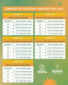 O programa Sua Nota Tem Valor, iniciativa do Governo do Ceará desenvolvida pela Secretaria da Fazenda, divulga nesta sexta-feira (29/12) tabelas atualizadas de descontos adquiridos pelos participantes do programa e que devem incidir no pagamento do Imposto sobre a Propriedade de Veículos Automotores (IPVA) 2024. Os boletos para pagamento do IPVA 2024 estarão disponíveis a partir do dia 2 de janeiro de 2024, no site da Sefaz.