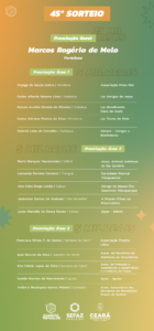 A Secretaria da Fazenda do Ceará (Sefaz-CE), por meio do Sua Nota Tem Valor (SNTV), anuncia nesta quinta-feira (18/4) os nomes dos ganhadores do 45° sorteio do programa. Marcos Rogério de Melo ganhou a premiação principal de R$ 25 mil. Outras 15 pessoas e 15 instituições sem fins lucrativos escolhidas por elas receberam os prêmios de R$ 5 mil. O sorteio n° 05858-0 foi realizado pela Loteria Federal na quarta-feira (17).