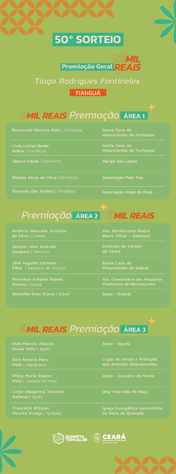 A Secretaria da Fazenda do Ceará (Sefaz-CE) anuncia nesta quinta-feira (19) os nomes dos ganhadores do 50° sorteio do programa Sua Nota Tem Valor (SNTV). O participante Tiago Rodrigues Fontineles, morador do município de Tianguá, foi o ganhador do prêmio principal de R$ 25 mil.