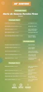 Os 15 prêmios de R$ 5 mil, divididos em três áreas do Ceará, beneficiam o cidadão sorteado e também a instituição por ele adotada, que recebe premiação no mesmo valor. Confira os nomes dos sortudos e das instituições adotadas por eles: