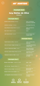Os 15 prêmios de R$ 5 mil, divididos em três áreas do Ceará, beneficiam o cidadão sorteado e também a instituição por ele adotada, que recebe premiação no mesmo valor. Confira os nomes dos sortudos e das instituições adotadas por eles: